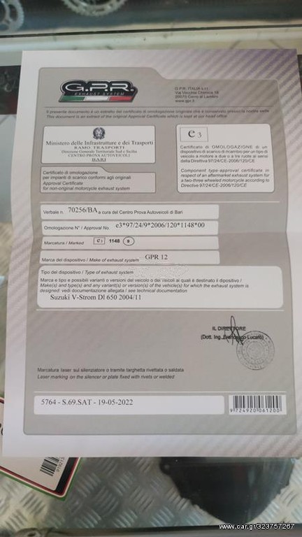 Κατασκευάζεται στην Ιταλία και συνοδεύεται από επίσημη εργοστασιακή εγγύηση 2 ετών GPR. Η εξάτμιση είναι ομολογκαρισμένη για χρήση δρόμου σύμφωνα με τις ευρωπαϊκές προδιαγραφές.