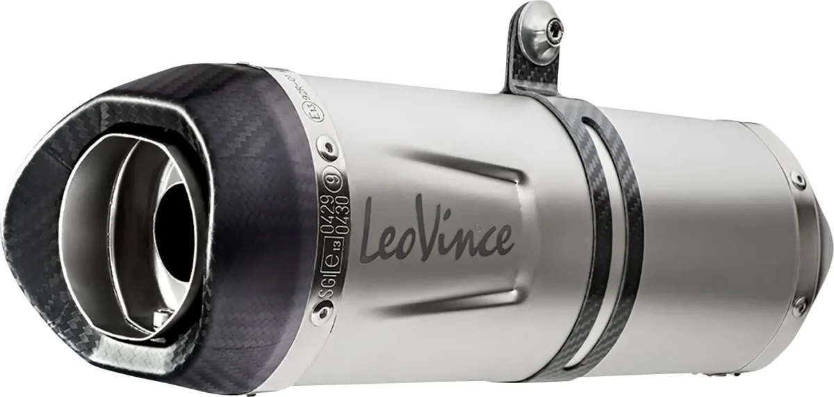 Η κατασκευή βασίζεται σε ανοξείδωτο ατσάλι AISI 304, με carbon τελικό καπάκι και carbon βάση στήριξης, προσφέροντας υψηλή αντοχή στη θερμοκρασία και στις καταπονήσεις. Το εσωτερικό υλικό πλήρωσης αντέχει έως 1650°F (≈900°C), διασφαλίζοντας σταθερή απόδοση και διάρκεια ζωής. Το λογότυπο LeoVince είναι χαραγμένο με laser για premium αισθητική.