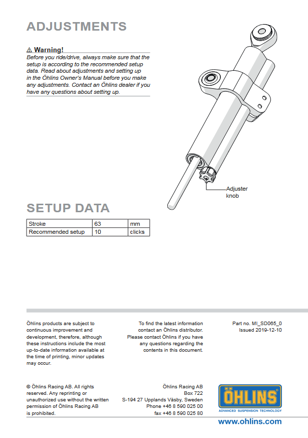 Χάρη στο ευρύ φάσμα ρυθμίσεων απόσβεσης, ο αναβάτης μπορεί να προσαρμόσει με ακρίβεια τη λειτουργία του steering damper στο προσωπικό του στυλ οδήγησης και στις απαιτήσεις της μοτοσυκλέτας. Το αποτέλεσμα είναι πιο καθαρή αίσθηση, αυξημένος έλεγχος και βελτιωμένη συνολική οδηγική συμπεριφορά, χωρίς συμβιβασμούς στην ποιότητα και την αξιοπιστία.